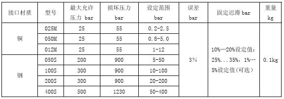 可調機械壓力開關內置活塞與精密彈簧相連,當壓力變化時,彈簧伸縮量發生相應變化,當壓力達到設定值時,會觸發預設的機械結構并發出開關信號。產品結構緊湊,采用DIN標準插頭,接線極其方便,測量范圍廣(0...400bar),過載能力高(可高達:1230 bar),高重復性,具有常開或常閉觸點,接點鍍金, 觸點容量大。可用于:水、油、氣體壓力的測量。