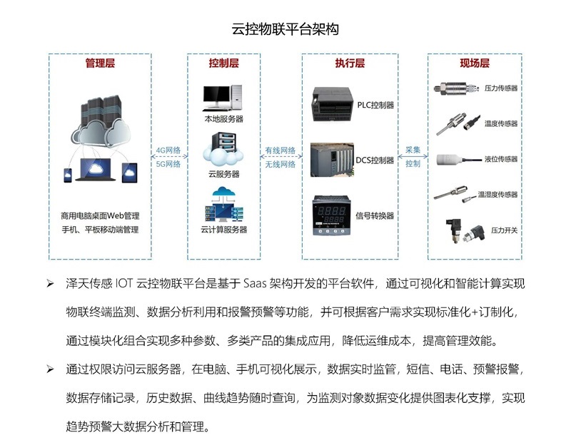 湖南澤天傳感研制的傳感器具有高精度、高靈敏度、高可靠性等特點(diǎn),已廣泛應(yīng)用于工業(yè)控制、工程機(jī)械、化工冶金、能源生產(chǎn)、環(huán)保監(jiān)測(cè)、食品醫(yī)療、航空航天等領(lǐng)域。澤天傳感研發(fā)的新一代智能傳感測(cè)控技術(shù),已正式應(yīng)用在基于物聯(lián)網(wǎng)傳感技術(shù)的云控物聯(lián)解決方案中,本方案設(shè)計(jì)為管控層、執(zhí)行層、現(xiàn)場(chǎng)層三級(jí)架構(gòu),利用物聯(lián)網(wǎng)和互聯(lián)網(wǎng)技術(shù),通過(guò)現(xiàn)場(chǎng)層的高性能傳感器實(shí)時(shí)監(jiān)測(cè)各種物理量,經(jīng)過(guò)控制層利用無(wú)線傳輸技術(shù)將數(shù)據(jù)實(shí)時(shí)傳輸?shù)皆贫耍倮么罅勘O(jiān)測(cè)數(shù)據(jù)進(jìn)行趨勢(shì)預(yù)測(cè)計(jì)算,實(shí)現(xiàn)多種參數(shù)、多類產(chǎn)品的集成應(yīng)用,降低運(yùn)維成本,提高管理效能,為自動(dòng)化控制、智能化生產(chǎn)等提供了有力支持。