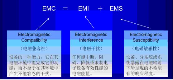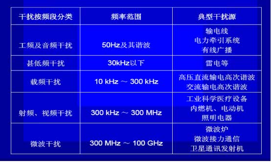 電磁干擾的產生包括發射源產生干擾噪聲的原因和接收源感受干擾噪聲的原因,發射源產生干擾噪聲的原因有:發射源的隱性頻率;發射源對接收源所產生的混附波與調幅干擾;發射源的不當調幅調變輸出;接收機本地振蕩噪聲;時鐘信號傳送的衍生噪聲;電機裝置如馬達繼電器;電力系統如火花電暈噪聲;閃電雷擊。接收源感受干擾噪聲的原因有:接收源射頻頻率選用不當造成噪聲滲入干擾;混附波與調幅干擾;電源線噪聲耦合至接收源造成干擾;電子盒箱柜隔離不佳滲入接收源造成干擾。電磁干擾的頻段劃分如下圖:
